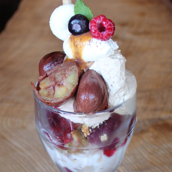 秋 和栗のパフェ 10月上旬から10月下旬 大粒の和栗を丁寧に コトコトと渋皮煮にしました。 渋皮煮、ペースト、アイス、 栗のさまざまな味を楽しめるパフェ。 1,650円(税込) ←PREV NEXT→